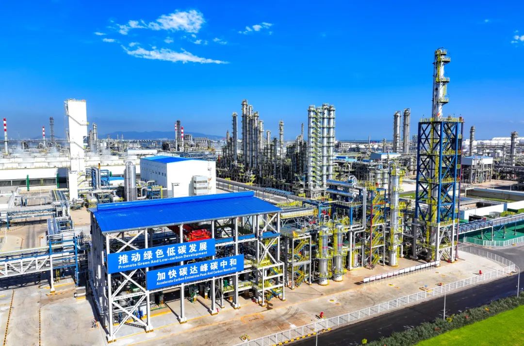 據(jù)介紹,石化生產(chǎn)過程中排放的二氧化碳被捕集后,與氫氣發(fā)生化學(xué)反應(yīng)形成甲醇,隨后通過系統(tǒng)管廊進(jìn)入下游裝置,用于制造鋰電池電解液溶劑、光伏膜材料等,形成了“二氧化碳捕集利用—綠色甲醇—新能源材料”的負(fù)碳產(chǎn)業(yè)鏈。