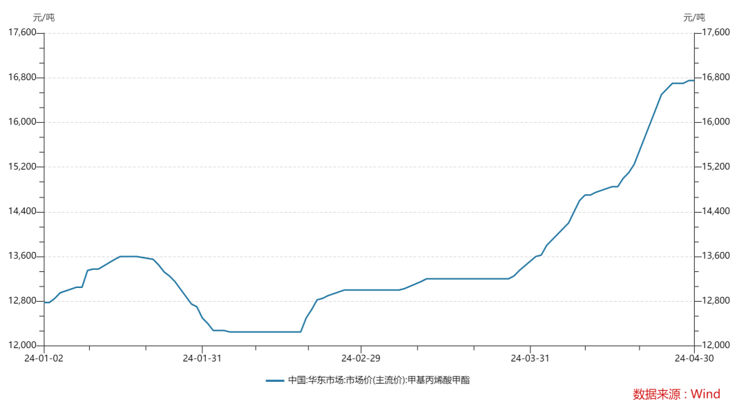 2024年以來,MMA價格進入明顯的上漲結(jié)構(gòu),4月份開始進入急漲狀態(tài),價格創(chuàng)近5年新高,漲幅近60%。